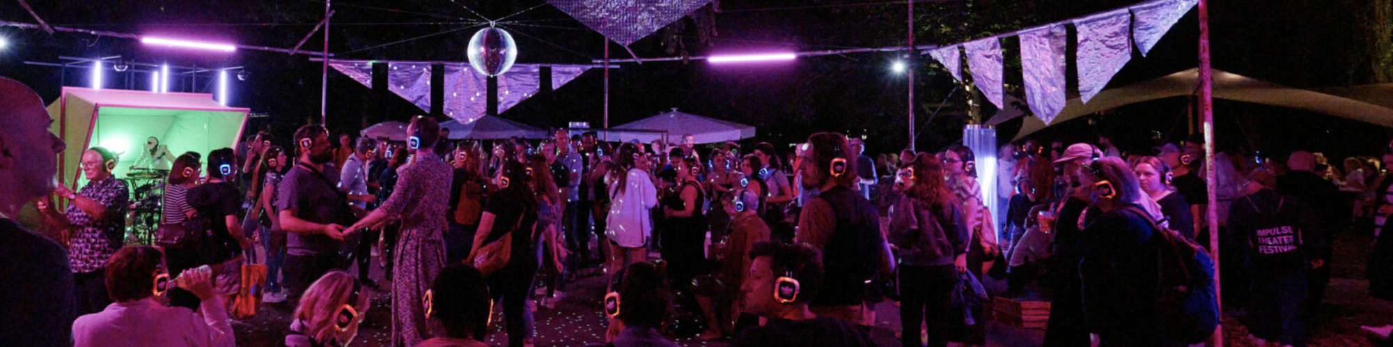 Atopia (Greek “a-topos” = “no place”) refers to something that cannot be categorized, something inexplicable—like love, or the performances of the Live Art guerilla and summer festival favorites JAJAJA.In their program RADIO ATOPIA, the audience listens to performances, DJ sets, and live radio shows through wireless headphones, turning any location into a stage—or a dance floor. At the Sommerfestival, JAJAJA (Arvild J. Baud, Iris Minich, and Oskar Minich) has become an essential part of the program. This year again, together with surprise guests from the local and international scenes, they transform the Avant-Garten into a dance floor every Friday and Saturday night. Night owls and curious festivalgoers can snag one of the coveted free wireless headphones and choose between three different channels and genres. JAJAJA and their guests fill these channels with diverse programming such as EDM DJ sets, live synthesizer concerts, or spoken word happenings—until everyone has become one happy celebration community.